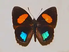 The wingspan is of about 47 mm. The uppersides of the forewings are black with a broad red median band. Also the uppersides of the hindwings are black, with an electric-blue area in the middle. The undersides of the forewing are similar to the upperside but show also a yellow band. The basic colour of the undersides of the hindwings is black, with six pale blue spots in the middle of a black oval surrounded by concentric yellow bands.