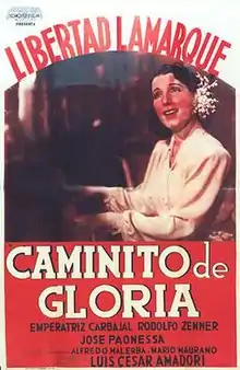 Caminito de Gloria is a 1939 Argentine musical melodrama film written and directed by Luis César Amadori. The film starred Libertad Lamarque, who sings "Caminito", the celebrated 1926 tango composed by Juan de Dios Filiberto with lyrics by Coria Peñaloza originally popularized by Carlos Gardel and Ignacio Corsini.[1] In 1960 Amadori remade this film under the title Mi último tango, starring Sara Montiel in the Lamarque role.