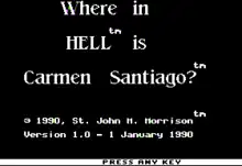 Where in Hell Is Carmen Santiago? is a 1990 game developed by St. John M. Morrison, which has players hunt down Carmen in the afterlife. Broderbund never recognized this as a part of the series.[25][26] It has the status of "a Copyrighted FreeWare".[27] The title screen started with the word "Heck", which was rubbed off and replaced with "HELL".[25] The creator of the game had never played a Carmen Sandiego game, but was very familiar of the franchise due to its constant appearance in gaming magazines. He crafted a first person adventure game based on this premise and copied the naming scheme of the titles.[28][27]