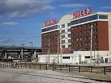 In 2020, the casino struck a deal with sports betting provider DraftKings to rebrand the property as DraftKings at Casino Queen.[15] As part of the rebranding, the property will undergo a $10 million renovation that will replace the property's current restaurants and buffet with a full sportsbook, a new all-day restaurant, and a food court with three new quick-service options. The casino will also be integrated into DraftKings' mobile betting app, and also reached an agreement with Fairmount Park Racetrack in nearby Collinsville to operate slots and table games on their property, although sports betting competitor FanDuel has the track's sports-betting license.[16][17][15]