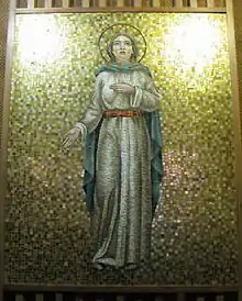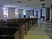 The Blessed Sacrament Chapel is immediately to the left of the sanctuary. A glass partition separates it from the rest of the main seating area. Capacity is 50 people. Within the altar of the chapel are relics from St. Clement, St. Irenaeus, and St. Liberatus. Five faceted glass windows in the chapel, created by Jacoby Studios in St. Louis, symbolize the functions of the priest. These windows are visible from the main seating area in the cathedral. The first window pictures the carpenter's hammer and square associated with St. Joseph, patron of priests. The second window shows the Greek symbols Chi-Rho, with rings and leaves indicating a priest's role in performing Christian marriages. The third window with a scroll and lamp illustrate a priest's service as teacher. The fourth window pictures a shepherd's crook and book, alluding to the pastoral duties and to promulgating the Gospels. The fifth window, which is in the sanctuary of the chapel, shows crossed branches, a crown, and a star as reminders of eternal reward in victory over death, and the priest's function in performing Christian burial. Also, within the chapel is a cross, known as the Jubilee Cross, which contains a relic of the True Cross. The cross was created by Lage's Cabinet Shop of Jefferson City for the Jubilee Year of 2000.