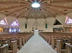 The cathedral church is built of reinforced concrete and steel, with an exterior facade of Indiana limestone. The interior of the church, which seats 950 people, has 19,000 square feet (1,800 m2) of terrazzo flooring. The church's diameter is 157 feet (48 m), and its main aisle runs 88 feet (27 m) from the glass doors to the altar. The cathedral's ceiling, at a height of 72 feet (22 m), is made of Douglas fir, supported by sixteen laminated wood beams that are about 60 feet (18 m) long. The beams meet at a steel ring, in the center, that is about nine feet in diameter. The ring creates an oculus, from which the spire rises to a height of 29 feet (8.8 m). The outer roof is made of copper, with sixteen gables in a design which signifies a crown.