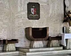The sanctuary wall is polished buff travertine. The steps and raised surfaces in the sanctuary are of contrasting walnut travertine. The altar is a single block of polished marble weighing 7000 pounds. Within the altar are relics from St. Clement, St. Irenaeus, and St. Aurelius. The sanctuary itself is oval-shaped and was designed specifically for ceremonies in which the bishop presides and for post-Vatican II liturgy. The cathedra or bishop's throne sits immediately beneath the bishop's coat of arms, which hangs on the sanctuary wall. The crucifix with a corpus of walnut travertine is suspended from the wall. The corpus is 5 feet (1.5 m) tall and weighs over 450 pounds (200 kg).
