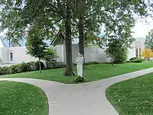 The campus features a 5-foot (1.5 m) solid marble statue of St. Joseph and the Christ Child. It faces east toward the Carmelite monastery and the chancery and is located on the east lawn. It was added to the campus in 2005 from a closed parish in St. Louis. Also on the east lawn, there is a pin oak, known as the Pentecost Tree, which was planted by Bishop Gaydos in 1999. Soil used to plant the tree was brought to the campus from each of the parishes of the diocese. At the Bishop's entrance to the cathedral, is a modern, concrete sculpture of St. Francis and the animals. It is a two-sided sculpture that is the work Siegfried Reinhardt of St. Louis. It was donated to the cathedral in 2009 by a parishioner. There is a cornerstone also near the Bishop's entrance. A limestone engraved sign adorns the front lawn. It was installed in 1985. There is a grotto of Our Lady of Fatima, which includes the figures of the Blessed Mother, the three seers, and animals. It is located on the south lawn and was donated by the closed LaSalette Seminary. Each of the figures is made of concrete and was restored in 2009.