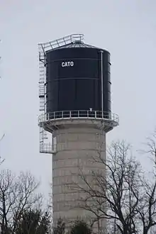 The Cato water tower stands 120 feet (37 m) over the village of Cato, to the northeast of the village center. The light blue structure had been a landmark for 75 years or more but was to be torn down as of June 2012. The new water tower was to be dark blue on top and still say "Cato" on both sides. It will sit on 82 feet (25 m) of concrete. It will also be bigger, holding 25,000 extra gallons of water, in anticipation of future town growth.