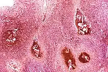 Certain bacterial infections also increase the risk of cancer, as seen in Helicobacter pylori-induced gastric carcinoma.[66] The mechanism by which H. pylori causes cancer may involve chronic inflammation or the direct action of some of the bacteria's virulence factors.[67] Parasitic infections strongly associated with cancer include Schistosoma haematobium (squamous cell carcinoma of the bladder) and the liver flukes, Opisthorchis viverrini and Clonorchis sinensis (cholangiocarcinoma).[68] Inflammation triggered by the worm's eggs appears to be the cancer-causing mechanism. Certain parasitic infections can also increase the presence of carcinogenic compounds in the body, leading to the development of cancers.[69] Tuberculosis infection, caused by the mycobacterium M. tuberculosis, has also been linked with the development of lung cancer.[70]