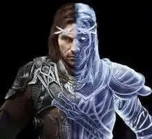 Celebrimbor appears in the 2014 video game Middle-earth: Shadow of Mordor where he is voiced by Alastair Duncan.[9][10] In order not simply to copy Peter Jackson's films, the game's makers Monolith Productions decided to combine a minor but significant Middle-earth character from The Silmarillion, Celebrimbor, with an original character of their own invention, Talion.[11][12] The game takes place sometime between the action of The Hobbit and The Lord of the Rings at which time Celebrimbor survives as an amnesiac wraith. After being bonded with Talion (a ranger of Gondor) the two become an immortal fighting team unable to leave Mordor. Over the game, Celebrimbor lends his abilities as a wraith to Talion, and the two recover Celebrimbor's lost memories of Sauron and the forging of the Rings of Power: Sauron comes to Celebrimbor to give him a powerful hammer to forge the rings, is betrayed by Sauron, is forced to inscribe the incantation in the One Ring but steals it, and is tortured and beaten to death by Sauron after an attempted coup. After the defeat of Sauron's captains, Celebrimbor describes defeating Sauron himself as futile and wishes to depart for Valinor, but is convinced to stay by Talion; he then mentions his desire to forge a new Ring of Power immune to Sauron's influence. This leads to the events of the 2017 sequel Middle-earth: Shadow of War, which reviewers described as "fun, inventive, exciting—and totally non-canonical".[8][13][14] In Shadow of War, Celebrimbor and Talion successfully forge a new Ring of Power that appears to be free of Sauron's influence and is stated to be equal in power to the nine Rings of the Nazgûl without their corrupting influence. They use their new Ring to take the fight to Sauron with an army of Uruks, with Talion noticing Celebrimbor becoming more aggressive and worn out. Eventually revealed to fully intend to overthrow Sauron rather than destroy him, Celebrimbor ends his bond with Talion and possesses Eltariel to use her to defeat Sauron. Talion survives by becoming a Nazgûl, and Celebrimbor is defeated when forced out of Eltariel and is quickly absorbed by Sauron trapping both of them in the form of a large flaming eye on top of Barad-dûr. Celebrimbor remains trapped as part of the Dark Lord until the One Ring is destroyed, freeing the spirit as Sauron dies.[11][15][16][17]