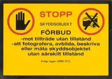 It is also illegal to photograph or in any way make a picture of or describe (in writing) and/or publish pictures or documents of military installations and other "protected objects" (skyddsobjekt). The designation of "protected object" can be applied to facilities, geographical areas, ships and aircraft, when in the interest of national security.