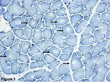 Histopathologic appearance of typical central core disease: NADH-TR, transverse section from the rectus femoris. Marked predominance of dark staining, high oxidative type 1 fibres with cores affecting the majority of fibres. Cores are typically well demarcated and centrally located (→), but may occasionally be multiple and of eccentric location.