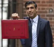 Sunak's first budget took place on 11 March 2020.[98] This included £30 billion of additional spending, of which £12 billion was allocated for mitigation of the economic effects of the COVID-19 pandemic, which had begun to spread rapidly throughout the country.[99] It was scheduled to be followed by another budget in the autumn, but in September 2020 the Treasury announced that budget would be scrapped because of COVID-19, with Sunak stating "now is not the right time to outline long-term plans – people want to see us focused on the here and now".[100]