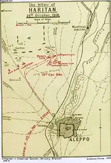 On 21 October the 15th (Imperial Service) Cavalry Brigade were issued orders to continue the advance to Aleppo. The brigade was preceded by seven light armoured cars, but the remainder of the division was following a day behind. On 24 October the armoured cars advance was stopped by Turkish defences near Khan Tuman. The Turks held a strong defensive line, on a ridge line to the south and west of Aleppo. The brigade was ordered to occupy a position on the Aleppo-Alexandretta road and to clear Turkish trenches on the ridge to the west of Aleppo. However, when they reached the ridge line on 26 October the position had been evacuated.[20] Intelligence from locals suggested that a force of one thousand men with two small artillery guns were heading north out of Aleppo, so the brigade set off in pursuit. At 11:00 the leading two Jodhpur Lancers squadron and a machine-gun section reached a position overlooking Haritan to the north of Aleppo, when they came under Turkish small arms fire. Brigadier Harbord in command ordered an immediate brigade attack, the Mysore Lancers would move around to the east of the ridge and charge the village followed up by the other two Jodhpur Lancer squadrons. While the remainder of the Brigade Machine-Gun Squadron would move onto the ridge to provide covering fire, with the two other Jodhpur squadrons. The armoured cars of No. 12 Light Armoured Motor Battery arrived at 11:30 and were ordered along the main road to support the attack. As the attack started the leading armoured car developed a fault and returned to their start position, a misunderstanding resulted in the rest of the battery following them, taking them out of the attack. The Mysore Lancers had also started their advance but discovered the Turkish line was longer than expected and had to move further east, out of range of their supporting machine-guns, to get into a position to charge. At 12:00 the lancers charged the Turkish position, killing fifty men and capturing another twenty prisoners. But without any fire support from their machine-gun squadron they were unable to penetrate into the Turkish defences and were forced to withdraw to the rear, dismount and keep the Turkish position under observation.[21] The extent of which had not until then been fully appreciated and was now estimated to be held by a force of three thousand infantry, four hundred cavalry, up to twelve artillery guns and between thirty and forty machine-guns. One group of Turkish soldiers started towards the Mysore Lancers position, but halted about eight hundred yards (730 m) short and started to dig new defensive trenches. Unable to progress against the larger force the brigade kept the position under observation and at 21:00 the Turks were observed to be withdrawing and had completely evacuated their positions by midnight. Just prior to that at 23:15 the 14th Cavalry Brigade arrived, setting up their own observation lines, until daylight when they took over the 15th Brigades positions. In the days battle Turkish casualties were estimated to be around 100 men, while the brigade had four British officers killed including Lieutenant-Colonel Holden, the senior Special Service Officer, attached to the Jodhpur Lancers, one Indian Officer and sixteen other ranks were also killed. Twelve officers, six of them British, and forty-four other ranks were wounded, another three other ranks were reported missing.[22][23] That night the Turkish forces withdrew twenty miles (32 km) to Deir el Jemel to the north-west of Aleppo. The 5th Cavalry Division was not strong enough by itself to continue the advance and halted waiting for the Australian Mounted Division to catch up with them.[24] However the day after their unsuccessful charge, 27 October the brigade became the division reserve and was ordered back to Aleppo.[22][25]