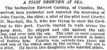 On 28 January 1890, John J. Canvin Sr., boarded the barquentine Edward Cushing of Camden, Maine, from the pilot-boat Charles H. Marshall, No. 3. He drowned when he was trying to steer the barkentine off Highland Light into port. He slipped over the railing into the sea. Efforts to find him showed that he had drowned. He was 68 years old and one of the oldest pilots in the service.[12]