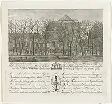 The Dutch Republic at the time was in the middle of the political upheavals of the Patriottentijd. The American Revolutionary War had just ended in 1783, but the Fourth Anglo-Dutch War, of which it was a part, only ended in 1784. There had therefore not been a British envoy for some time, but at the end of 1784 the new British envoy Sir James Harris also came to The Hague. They would be each others opponents in the coming years. Both were deeply involved in the internal politics of the country, Vérac on the side of the Patriots, the opponents of the Orangist party of the stadtholder William V, Prince of Orange.[Note 2] Harris became the de facto leader of the Orangists. Both engaged in espionage and covert political operations against their political opponents. Vérac actively supported the aspirations of the "democratic" wing of the Patriots, latterly also against the Patriot regenten, when the two factions became each others enemies. During the Patriot Revolt of 1785-1787 Vérac financially supported the Free Corps that occasionally fought the Dutch States Army troops of the stadtholder.[3] After the incident on 28 June 1787 of the arrest of Princess Wilhelmina, the spouse of the stadtholder, who was the sister of king Frederick William II of Prussia,[Note 3] a European diplomatic crisis developed. France tried to keep the Prussians and British at bay, while protecting its interests in the Dutch Republic. Unfortunately, the French foreign policy was in disarray after the death of minister Vergennes earlier in 1787. The new foreign minister Montmorin had a less sure hand. Also, there was a government crisis at the end of August,[Note 4] just when the Prussian invasion of Holland was imminent.[4] The political maneuvering in France between the different factions undermined his position, as the chevalier de la Luzerne was angling for his job.[5] Vérac was recalled on 20 August 1787. Montmorin assured him that there was no personal dissatisfaction with him, and that he would receive a pension while a new position was found for him.[6] Vérac's biographer Michaud speculates that the recall was motivated by the fact that Vérac opposed the return of the stadtholder as military governor of The Hague (a post he had been deprived of by the States of Holland in 1786),[1] but this is unlikely as it was official policy of both the French government and the Dutch government in power at the time, just as he had faithfully executed the French policy towards the Patriots.[6]