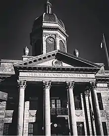 The courthouse is located at the corner of Central and Peachtree Streets. The Classical Revival building, built in 1926 to a design by James J. Baldwin, was the second built on the site. The prior courthouse on the site burned twice, but after the second fire was not salvageable. The blue marble-faced two story building has a five-bay diagonal section facing the roadway that forms its entrance. It has a four-columned Corinthian Greek portico, and is topped by a monumental cupola which rises well above the structure. All the blue marble used for the construction was quarried locally from area mines. The building interior, especially its courtroom, has retained much of its original woodwork and stone styling.[2] The courthouse underwent a substantial remodel around 2011, which modernized the interior, but in turn cost the building some of its original interior features. The remodel also added additional court rooms, and offices to the rear section of the building. The old Cherokee County Jail which was built in 1922 was demolished in order to make room for the new addition. The copper lantern which sits atop the dome, was removed around 2017 to make crucial repairs to the lantern. It was in danger of collapsing in on itself, due to structural deterioration over the years, as well as being riddled with bullet holes. The lantern was restored locally with help from The Cherokee County Board of Commissioners, the Cherokee County Maintenance Department, Tri-County Community College Welding Department, as well as numerous other skilled local residents.