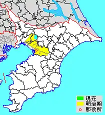 The original modern extent of Chiba District (yellow) until 1921 within Chiba Prefecture (white), with 21st century municipal borders (black); blue: territory gained from Inba in 1954; red circle: seat of the district government