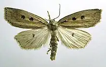 N. maritima Tausch (= sericea Curt., anella Stph.). Forewing silky grey: the veins pale grey, the intervals darker, stigmata pale, hardly perceptible; outer line alone represented by a curved row of black vein-dots; hindwing pure white, with traces of an outer row of dark dots; — ab. ulvae Hbn. has the forewing along the centre rufous ochreous, the costa dark grey with the veins pale; the stigmata lined with white; outer line of dots followed by a dark shade and a row of minute dots before termen; hindwing ochreous white, with a grey cellspot and outer row of dots; — in ab. bipunctata Haw. (= nigromaculata Schmidt) (48 e) the two stigmata are deep black, with a small black spot at base of cell; in wismariensis Schmidt a broad black stripe runs longitudinally through the middle of wing from base to termen;— in nigrocostata Stgr. a broad black stripe runs along the costa; — nigristriata Stgr. is more like the typical grey form but with many black streaks running parallel to the veins. Larva ochreous with fine dark and light longitudinal lines; bead and thoracic plate brown.[1] The wingspan is 29–36 mm.