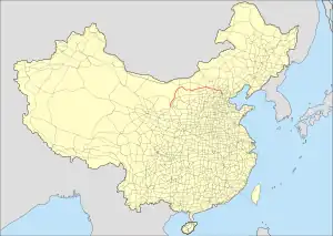China National Highway 110 (G110) runs from Beijing to Qingtongxia, via Hohhot, Baotou in Inner Mongolia, and Yinchuan. It heads northwest from Beijing to Zhangjiakou then heads straight west, and runs to approximately 1,100 kilometers (680 mi).