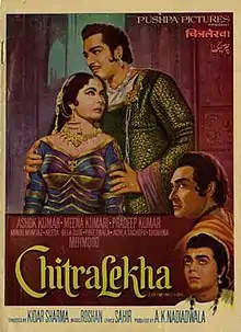 Chitralekha is a 1964 Indian Hindi-language historical drama film directed by Kidar Sharma and starring Ashok Kumar, Pradeep Kumar and Meena Kumari. It was based on the 1934 Hindi novel of the same name by Bhagwati Charan Verma about Bijgupta serving under the Maurya Empire and the king Chandragupta Maurya (340 BCE – 298 BCE) and his love for the courtesan Chitralekha.[1] The film's music and lyrics were by Roshan and Sahir Ludhianvi, respectively. The film was noted for songs such as "Sansaar Se Bhaage Phirte Ho" and "Man Re Tu Kaahe na dheer dhare" which is a pensive song which conveys the quintessence of life about letting go of the good and bad. In 2010, Outlook India magazine asked 30 Indian leading composers, lyricists and singers to name their all-time favorite Hindi songs. A list of top 20 songs was published and the top of the chart was ‘Man Re Tu kahe na dheer dhare.’"[2][3]
