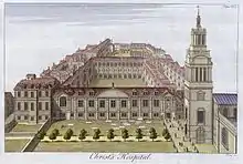 Christ's Hospital's buildings in London in 1770, with the tower of Christ Church Greyfriars at right