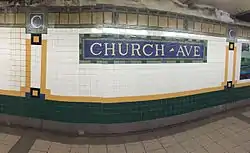 Each platform was re-tiled during a 1997 renovation with a reproduction of its original 1920 Dual Contracts era tiling. The name tablets contain "CHURCH AVE" in serif font on a blue background and green border. The station's trim line consists of light brown color with a mostly green border and "C" tablets (for "Church") at regular intervals.