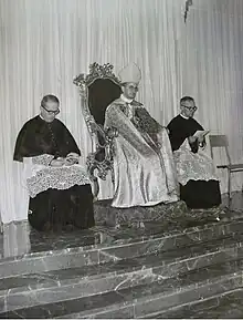 A committee was formed to screen the project, which was entrusted to engineer Claudio Latocca[3] and carried out with the collaboration of architects Olgiati and Sartorio.De Carli (1994, p. 141) The work was supported through collections and offerings of gold from the faithful.[4] In addition, the parish proceeded to sell some areas of the land it owned, which it had received as a donation from benefactress Catina Cornelio.[5] On March 3, 1957, Cardinal Giovanni Battista Montini, archbishop of Milan, laid the foundation stone,[6] and work continued until 1961, when it was completed. The initial project also included the construction of a "Parish Works Center," connected to the church through a portico, and a bell tower, both of which were never built.[3] On March 19, 1961, the church was blessed by Monsignor Mario Civelli, a missionary bishop in China of Balsamese origin, who celebrated the first Mass.[6] On the occasion of the celebration of Corpus Christi, the date of the consecration of the church by Cardinal Montini was announced, which was held on June 3, 1961.[7] Subsequently, Don Carcano arranged for the placement of the paintings depicting the Stations of the Cross.[8]