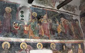 • The frescoes on the half-shaped vault in the naos, today almost destroyed, contained standing representations of Old Testament prophets, as shown by the small remains of the painting. In the southern half and in the eastern part, there are the remains of three standing figures. Comparing the size of the space in the extension, it can be assumed that there were ten figures on that side, that is, on both sides of the vault a total of over twenty.[10]