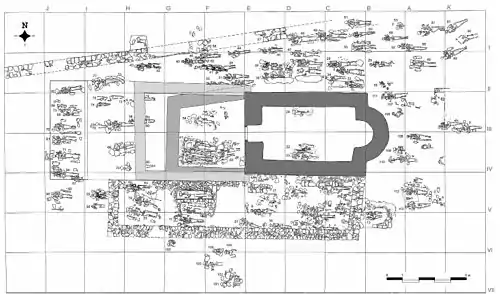 The nave, measuring 4.2x3.35m, was separated from the large altar space by a wall altar partition. Due to the limited area of the altar, the original altar table made of bricks was set up with the apse wall. All that remains of it is a print on the surrounding painting, surrounded by a red border, and a substructure discovered during archaeological excavations. It is about a meter from the floor, topped with shingles, approximately 0.7 meters wide, which stood on a stone column.[7]