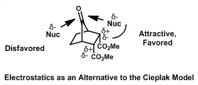 In the case of substituted norbornones, stereoselectivity may be explained by electrostatic interactions between substituents and nucleophiles. Electron-withdrawing groups create a partial positive charge on the alpha carbon, which interacts favorably with the partial negative charge on the incoming nucleophile.[20] This interaction may guide attack syn to the electron-withdrawing substituent, and anti to electron-donating substituents. This conclusion is supported by computations, where modeling the partial charges predicts product distribution without including orbital interactions.[21] The same explanation has been made to justify similar results in the case of substituted adamantones.[22]