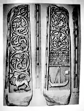 The early clan seems to have had a close connection with the abbacy on the small Inner Hebridean island of Iona. The abbacy of Iona was first founded in 563 by Saint Columba, and many following abbots were selected from his kindred (Cenel Conaill: descendants of Conall Gulban, who was Columba's great-grandfather and the founder of Tír Conaill).[9] Moncreiffe speculated that the MacKinnons were also of this kindred, and noted their coat of arms bore the hand of the saint holding the Cross.[9] Several MacKinnons were Benedictine Abbots of Iona, who were leaders of the Benedictine monastic community on the island of Iona. Finghuine MacFhionghain (fl. 1357–1405), and Eoin MacFhionghain (John MacKinnon, son of Lachlan MacKinnon) (1467–1498) who was the last Benedictine Abbot of Iona. His tomb lies in Iona to this day, along with the shaft of a Celtic cross, known today as 'MacKinnon's Cross', dedicated in 1489 to himself and his father (Lauchlan),[22][23] which is inscribed: "Hec Fingone: et: eivs: filii: Johannis: X: abbatis de Hy: facta: anno: Domini: måccccålxxxåixå".[15]