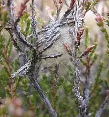 The larvae feed on Rubus chamaemorus, Sorbus aucuparia, Calluna vulgaris, Vaccinium uliginosum, Andromeda polifolia, and Empetrum nigrum. Larvae can be found from May to July. Pupation takes place in a conspicuous yellow cocoon. The females live in the cocoon and deposit the eggs there. The species hibernates as an egg.