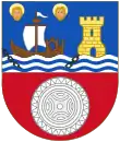 BlazonParty en fess: 1 azure, a tower or, to its right a ship in natural colours that has broken a chain sable. At the base, waves argent and azure, in chief two male heads, severed and haloed; 2 gules, a disc-shaped stele with geometric ornaments.