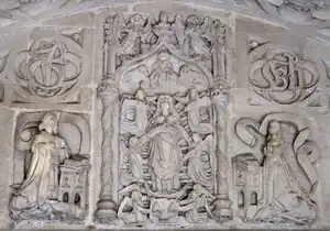 An elaborate pre-Reformation relief stonework sculpture, showing the Drapers Company arms in a relevant context, survives in the Greenway Porch, built in 1517 against the south wall of St Peter's Church in Tiverton, Devon, by the wealthy merchant John Greenway (d.1529), a member of the Drapers Company and of the Merchant Adventurers Company. It shows Greenway (left, with monogram "JG" in a quatrefoil above) and his wife kneeling on either side of the Virgin Mary who is ascending into Heaven. Below the Virgin is an heraldic escutcheon showing the arms of the Drapers Company (Azure, three clouds radiated proper each adorned with a triple crown or), with the very rarely surviving pre-Reformation angel supporters, the Virgin being the patroness of the Drapers Company.