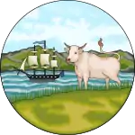 The colours and objects on the coat of arms carry cultural, political, and regional meanings. The ship from the Tudor period represents the Desire, the vessel in which John Davis is reputed to have sighted the Falkland Islands in 1592.[10][11] The ram epitomises sheep farming, which was historically the principal industry of the islands,[10][14] together with the production of wool.[15] The importance of these industries declined after the establishment of a 240 km (150 mi) fisheries zone around the territory,[15][16] which was announced in October 1986 and took effect in February of the following year.[17][18] The tussock grass that the ram is standing on evokes the native vegetation of the Falklands.[10] The motto on a ribbon scroll under the escutcheon, Desire the Right, alludes to the name of the aforementioned ship.[10][14]