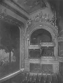 The theater was designed by William H. McElfatrick and had a capacity of 1,385.[1] It occupied the ground floors of the new office building. The decor was a form of Beaux Arts. There was a mural painted by Arthur Thomas above the proscenium arch called "The Goddesses of the Arts." There were two balconies, as was common with theaters designed by McElfatrick. The theater was one of the first to have a ventilation system that partially cleaned the air of tobacco smoke.[2]