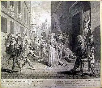 Départ des comédiens italiens en 1697, engraving by Louis Jacob of the painting by Watteau