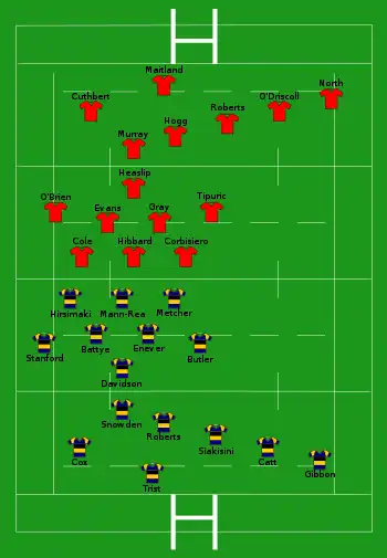 Reds flanker Beau Robinson was in the initial squad but withdrew following an injury he suffered while playing for the Reds against the Lions on 8 June. He was replaced by his Reds' teammate, Jarrad Butler.[4] The other player forced to withdraw from the squad due to injury was NSW Country flyhalf Ben Greentree. He was replaced in the starting lineup by Queensland Country player Shaun McCarthy, with fellow Queensland Country player Rory Arnold brought into the lineup on the bench to complete the squad.[4]