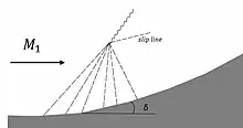 A Prandtl–Meyer compression is the opposite phenomenon to a Prandtl–Meyer expansion. If the flow is gradually turned through an angle of δ, a compression fan can be formed. This fan is a series of Mach waves that eventually coalesce into an oblique shock. Because the flow is defined by an isentropic region (flow that travels through the fan) and an anisentropic region (flow that travels through the oblique shock), a slip line results between the two flow regions.