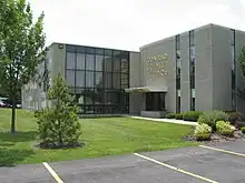 In 1950, Bernard O. Gruneke, then art director of Conrad Schmitt Studios, was one of the first American artists to experiment with the dalle de verre technique of producing stained glass (also known as "slab glass" or "faceted glass").[5] Gruenke was inspired while traveling in France during the 1940s, and is credited with what may be the first dalle de verre window created in the United States.[6] Experiments with epoxy and support structure at Conrad Schmitt Studios led to the first large-scale installations of faceted glass in the country, including a chapel at Notre Dame University's Moreau Seminary in South Bend, Indiana in 1959.[7]
