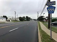 Past Route 47, CR 555 splits from Route 49 by turning north onto Third Street. The route passes areas of homes a block to the east of Route 47, crossing a Winchester and Western Railroad line and intersecting CR 552 Spur. Past the CR 552 Spur junction, CR 555 turns northeast onto Wheaton Avenue and runs near more residences before heading into industrial areas. The route enters residential areas again before intersecting CR 678, where it heads into Vineland. A short distance later, the road interchanges with the Route 55 freeway and comes to the junction with CR 655. CR 555 continues into wooded areas of homes as South Main Road, crossing CR 552. The route continues north into more dense residential development and widens into a four lane road as it enters a mix of homes and businesses, with CR 540 joining the route for a brief concurrency. Past CR 540, CR 555 continues north past more commercial development on North Main Road, becoming a three-lane road with a center left-turn lane as it reaches an intersection with CR 681 and crosses the Southern Railroad of New Jersey's Southern Running Track line. The road continues into a mix of farms and development, narrowing back to two lanes at the CR 619 junction.[1][2]