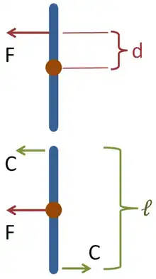 A force F applied to a rigid body at a distance d from the center of mass has the same effect as the same force applied directly to the center of mass and a couple Cℓ = Fd. The couple produces an angular acceleration of the rigid body at right angles to the plane of the couple.[3] The force at the center of mass accelerates the body in the direction of the force without change in orientation. The general theorems are:[3]