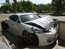 From as early as May 2021, Charli took on an evil, demonic or soulless persona while teasing and promoting the record, so as to play into a deal-with-the-devil idea.[52] George Griffiths of the Official Charts Company compared the concept to Marina's Electra Heart (2012).[53] Visuals for the album include "femme fatale powers" and a multitude of "dark spells and curses" as well as signature nods to both cars and car crashes. Several publications found references to the David Cronenberg films, mainly the 1996 film of the same name and Videodrome, the former of which is also an aesthetic inspiration.[54][55][56] Charli talked about the aesthetic themes and the reference to the Cronenberg film by saying, "Referencing Cronenberg is unavoidable when the album is called Crash. [...] For this album, I was exploring the idea of what the most sexualized, heightened, vampiric version of myself could be. And I think that also plays into the 'selling your soul' narrative [and] danger — it's very volatile, the image of this album. I think some people are really turned off by it, which is quite interesting, and some people love it. It's heightened sex, sexiness — that's where I was at. And I think that does relate back to Cronenberg's Crash because that book and that movie is about these people who want and feed off their favorite thing and will go to any length to feel this sexuality and connection."[57] In accordance to this statement, Under the Radar wrote in their review: "The intersection of violence, sexuality, and technology explored within the album's cover art calls to mind influential science fiction writer and cultural prophet J. G. Ballard's contentious 1973-released novel Crash—and, by extension, Cronenberg's 1996-released film adaptation. Deft studies of humanity's psychological and physical transformation alongside technological and cultural advancement, both novel and film reveal a world 'beginning to flower into wounds.' This merging of flesh and blood with steel and plastic is fully embodied within the album's production, which (mirroring Ballard's prose) applies a highly technical and intricately calculated approach, pristine melodies scrubbed of any discernible warmth or familiarity, courtesy of Charli XCX and her team."[58]