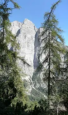 Croz dell'Altissimo is a mountain in the Brenta group (It.: Dolomiti di Brenta), a subgroup of the Rhaetian Alps in the Italian Region of Trentino-Alto Adige, with a height of 2,339 metres (7,674 ft)).[1] The mountain is mostly known for its imposing South-West face that rises with a straight vertical 900 meters from Val dell Seghe, above Molveno, up to the summit ridge. The mountain has actually two distinct summits, a NW and a SE summit, of which the former is slightly higher but the latter bears the cross. The east and north sides of the mountain are quite easily accessible for hikers.