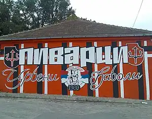 They are in brotherhood with the organized fan group of FK Zemun, the Taurunum Boys.[4] They have this relationship since 1998. It all began when a prominent Taurunum Boy member has lived and has a family in Kragujevac and the Taurunum Boys visited a barrage match back when Radnički Kragujevac fought to enter the major leagues. Ever since then the brotherhood has been growing and growing, and today it has been passed to the younger generations.[5] The Đavoli have also a long friendship with fans of Sloga Kraljevo, the Kasapi ("The Butchers"). This friendship can be seen during football and basketball matches, where they chant together in the stands. It also started recently good relations with the organized supporters of Radnički Niš, the Meraklije. Also have personal friendship with some fans of Lech Poznan. Their relations began mainly through the mutual support of the growing local patriotism in the Serbian fan scene. There is a connection between the clubs as they share the year which they were founded, 1923.[6] Also, both groups were founded in the same year, in 1989.[4] The name Radnički means "Labour's" in Serbian and its roots come from the relations which the clubs had with Labour movements during the first half of the 20th century. Their often mentioned slogan is: "Radnička deca, radnička braća", which translates to "Workers children, workers brothers". Another connection is their anti-fascist attitude through similar tragedies which happened in both cities during the World War II. In the city of Kragujevac the Kragujevac massacre and in Niš the Bubanj massacre, both committed by Nazi German soldiers, which had in both cities a strong influence on subsequent generations. All reasons, why the first top tier match between these clubs ended during the 2012–13 season especially in a respectful and peaceful atmosphere for each other, although they not played against each other for a long time.[7]