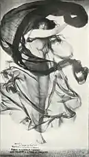 Lululaund – The Dancing Girl (painting and silk cloth. A.L. Baldry 1901, before p. 107), The inscription reads; "Dancing is a form of rhythm/ Rhythm is a form of music/ Music is a form of thought/ And thought is a form of divinity."