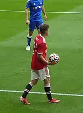 On 6 June 2019, James underwent a medical with Premier League club Manchester United ahead of a transfer for a reported fee of £15 million with the potential for additional payments.[27] After agreeing a deal "in principle" on 7 June,[28] United announced the signing of James on a five-year contract on 12 June, with an option to extend for a further year.[29] He scored his first goal for the club on his competitive debut, coming on as a substitute to score United's final goal in a 4–0 win over Chelsea.[30] He also scored in United's 2–1 loss against Crystal Palace.[31] In only his fourth game for United he scored his third goal for the club in a 1–1 draw with Southampton,[32] which was later voted goal of the month by United fans.[33] James was also voted United player of the month for August.[34] In March 2020, Daniel James ended a seven-month goal drought by scoring in a 5–0 win over Austrian team LASK, the final game before the suspension of football caused by the COVID-19 pandemic.[35]