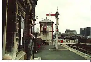 In its latterday BR guise, the signal box was located on the south side of the level crossing (up side) and there was a lattice footbridge immediately north of the crossing. The signal box disappeared after closure and the footbridge was eventually removed for use on a heritage railway. Under Peak Rail auspices, a signal box (originally at Bamford but relocated from the erstwhile Buxton steam centre) was sited at the southern end of the Up platform (see pictures), with a level crossing (Station Road) just beyond it. This signal box was merely of cosmetic use, with the crossing controlled by a crossing keeper's hut at road level (located on the Down side, and across the road from the station). In March 2008, the crossing keeper's hut was replaced by a more extensive new structure built in a traditional style, required as part of the increased signalling equipment on the railway. The latter has, in effect, split the operation into three controlled sections, permitting better timetabling and more efficient services, while also providing the necessary infrastructure to cater for extensions to the present line. The raised signal box was dismantled on 14 January 2014, the upper half being removed for further use at Rowsley, the lower section being judged unfit for further use and dismantled. As the original footbridge has subsequently been re-acquired and returned, the plan is that it will take its old position in due course.