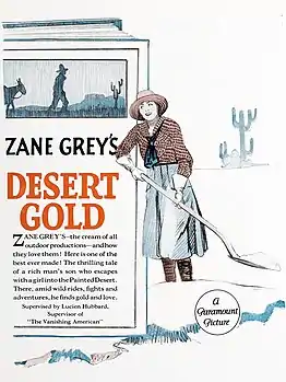 Desert Gold is a 1926 American silent Western film directed by George B. Seitz. According to silentera.com the film survives while Arne Andersen Lost Film Files has it as a lost film.[2][3] Portions of the film were shot near Palm Springs, California.[4]: 168–71 It is based on the 1913 novel of the same name by Zane Grey.