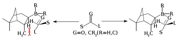 In the above mechanism where G=O and R is Ipc and Cl or 9-Borabicyclononane. Diisopinocampheylchloroborane (Ipc2BCl) is produced by treating diisopinocampheylborane with hydrogen chloride. The chloride is reported to be more stable that the trialkyl boranes,[4] it works well with aryl alkyl ketones and tert-butyl alkyl ketones. Diisopinocampheylchloroborane is often complementary with diisopinocampheylborane, where one provides the R enantiomer and the other the S, the enantioselectivity is typically very high.[9][10]
