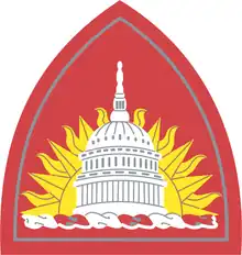 A gold color metal and enamel device consisting of the dome of the United States Capitol in white in front of a gold rising sun and supported by a torse of six twists alternately of white and red; on a blue scroll arched above the dome, the motto, Capital Guardians, in gold.[41]