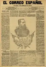 Gortázar's father was a Liberal, active republican[96] and friend of Castelar.[97] It is not clear how the young Dolores developed Traditionalist sympathies; in the 1890s she was already a declared Carlist.[98] Initially her activity was about organizing prayers[99] and donations for the Spanish army fighting in Cuba,[100] yet already in 1899 she engaged in veladas artisticas of the León círculo carlista.[101] Successful proselytizing in private[102] she took up propaganda works also in public, commencing cooperation with the semi-official Carlist mouthpiece, El Correo Español.[103] In 1900 rumored even to launch her own Traditionalist daily,[104] at that time she was already known as "ilustre dama carlista".[105]